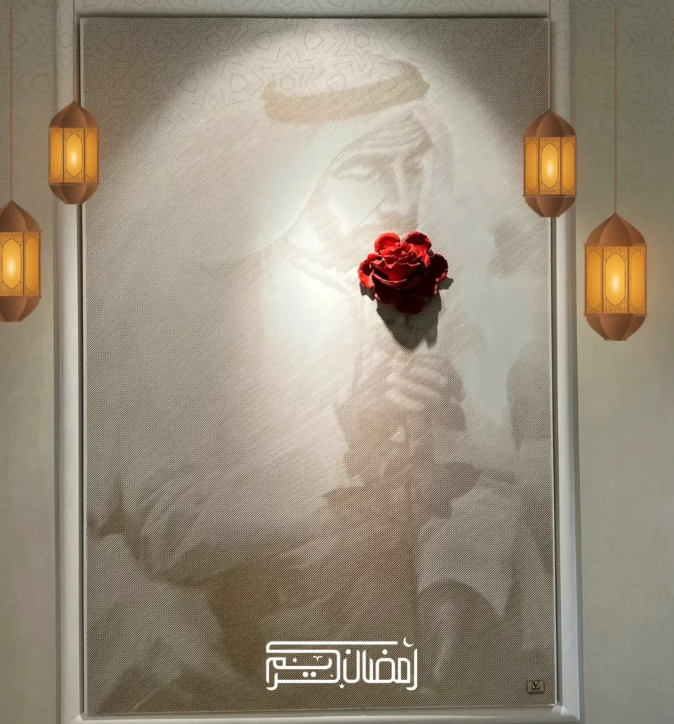 تحفة فنية محفورة بتقنية 2D و3D على الخشب، بإطار جبسي مزخرف يدويًا مع وردة حمراء مصنوعة بعناية.