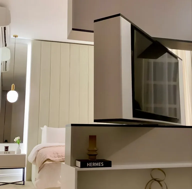 قطعة مبتكرة من خشب PVC للفصل بين فراغين مع استغلال عملي وأنيق للمساحة.