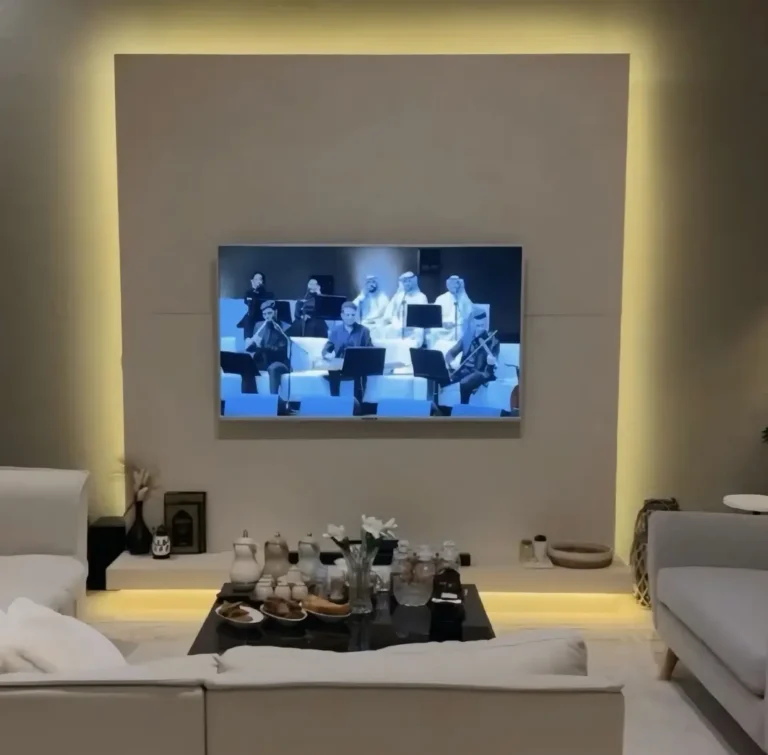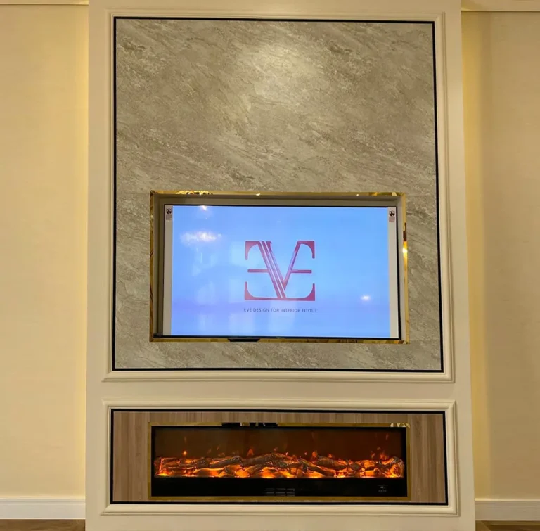 مدفأة ديكورية جبسية بإرتفاع الجدار مع تجويف وسط وإنارة مخفية (15x220x340) سم.
