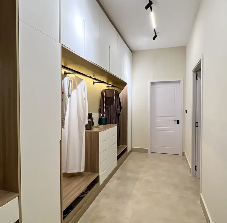 تصميـم وتنفيذ غـرف ملابس بخامات عاليـة الجودة وألوان متجددة. خيار عملي ينظم مساحتك ويضيف لمسة فاخرة للمكان.